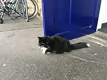 The first station cat, Felix, joined the staff as a nine-week-old kitten in 2011.[19] Since then she has patrolled the station to keep it free from rodents, and even has her own cat-flap to bypass the ticket barriers.[20] In 2016, Felix was promoted to Senior Pest Controller.[21] In 2016, local artist Rob Martin painted a portrait of Felix which now hangs in the station.[22]