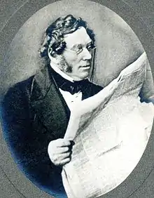 In about 1840, Pattinson travelled to Canada in the hope of setting up a mining business,[3] stopping at the Niagara Falls long enough to make the earliest known photograph of the falls, a daguerreotype which survives (2009) in the collection of Newcastle University. It was once believed that the small figure standing silhouetted with a top hat was added by an engraver working from imagination as well as the daguerreotype as his source, but the figure is clearly present in the photograph.[8] Because of the very long exposure required, of ten minutes or more, the figure is assumed by Canada's Niagara Parks agency to be Pattinson himself.[8] The image is left-right inverted, and taken from the Canadian side.[9] Pattinson made other photographs of the Horseshoe Falls as well as of Rome and Paris. These were then transferred to engravings to illustrate Noël Marie Paymal Lerebours' Excursions Daguerriennes (Paris, 1841–1864).[1] Aside from being the first known photograph of the Falls, Pattinson's image is also the earliest known surviving photograph of any part of Canada, which wouldn't become a nation for another 27 years.[10]
