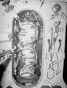 Mackenzie's next assignment was as commanding the Underwater Detection Establishment (UDE), a post normally held by an anti-submarine specialist rather than a submariner[44] and was commander of the 1st Destroyer Squadron from June 1954 until December 1956.[45] During a training exercise, his ship, HMS Chevron was damaged in a collision with the aircraft carrier HMS Centaur. Mackenzie received a dressing down from the Commander-in-Chief, Mediterranean Fleet, Admiral Lord Mountbatten.[46] He returned to submarines as Chief of Staff to the Flag Officer Submarines,[45] Rear Admiral Wilfrid Woods, and then Rear Admiral Bertram Taylor. On a visit to the United States, he was given a tour of the first nuclear-powered submarine, the USS Nautilus.[47] After that he became Captain of the Boys' Training Establishment HMS Ganges at Shotley, Suffolk, in January 1959.[21] While there he completed the two-month Senior Officer's War Course at Greenwich.[48]