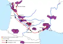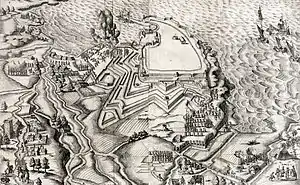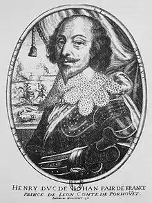 In February 1625, Soubise led a second Huguenot revolt against Louis XIII,[6] and, after publishing a manifesto, invaded and occupied the island of Ré, near La Rochelle.[7] From there he sailed up to Brittany where he led a successful attack on the royal fleet in the Battle of Blavet, although he could not take the fort after a three weeks siege. Soubise then returned to Ré with 15 ships and soon occupied the Ile d'Oléron as well, thus giving him command of the Atlantic coast from Nantes to Bordeaux. Through these deeds, he was recognized as the head of the Huguenots, and named himself "Admiral of the Protestant Church".[8] The French Navy on the contrary was now completely depleted, leaving the central government very vulnerable.[9]
