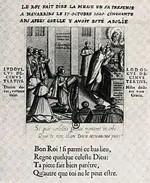 Meanwhile, the Treaty of Montpellier was negotiated, putting an end to hostilities. The Huguenot fortresses of Montauban and La Rochelle could be kept, but the fortress of Montpellier had to be dismantled.[3]