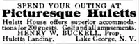 Until 1874 the Huletts Landing area was known as Bosom Bay.[3] Successive generations of the Hulett family lived by farming the area until Philander Hulett began to develop the area in the 1870s by building a steamship landing and submitting an application to build a post office.[4] The post office application is the earliest document to use the Huletts Landing name.[4] The existing Lake George Steamboat Company, which delivered mail as well as passengers, probably required either a post office or a tourism facility in order to justify adding a new stop to its schedule.[4] An influential travelogue by Rev. William Henry Harrison Murray was published in 1868 and praised the Adirondacks for the relaxing effects of its picturesque wilderness.[5] The first railroad service into the region was also built in the 1870s.[5] The application received approval and Philander Hulett built the post office shortly afterward, housed in the same building as the community's first store.[4] He served as postmaster until his death in 1883, but sold his property.[4]