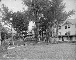 The first Lakeside Inn was constructed for John W. Hall in 1877–1878 on a 1 acre (0.0040 km2) lot.[6] Although the only direct access to Huletts Landing was by ferry, a combination of train, coach, and ferry was normal for Adirondack vacationers of the period.[5][6] Huletts Hotel grew from expansions on the original farmhouse until a fire destroyed it on 14 November 1915.[6] It was hastily rebuilt for the 1916 tourist season, but questions of arson arose, and led to trial.[7] Tourism has continued to be a mainstay of the community's economy. Adirondack Park was originally established in 1892.[5] In 1931 an eastward expansion brought Lake George and its communities within park boundaries.[5]