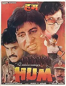 Hum (transl. We) is a 1991 Indian Hindi-language action crime film directed by Mukul S. Anand. It stars Amitabh Bachchan, Rajinikanth, Govinda, Kimi Katkar, Deepa Sahi, Shilpa Shirodkar, Danny Denzongpa, Anupam Kher and Kader Khan. This was the most successful film for the famous super star Bachchan in the early '90s before he announced his temporary retirement (for five years) immediately after its release. He also won the Filmfare Best Actor Award for it in 1992. The film was the second highest-grossing Indian film of 1991 at the box office and was a blockbuster.[1] The movie was an inspiration for the 1996 Kannada movie Soma. Before that, it was adapted into the 1995 Tamil movie Baashha starring Rajinikanth in the lead which went on to be remade in Kannada in 2001 as Kotigobba , in Bengali in 2003 as Guru and in Bangladeshi in 2001 as Sultan starring Mannna. Dilwale (2015) also was loosely inspired by this film.