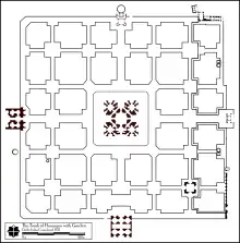 This chamber with high ceiling is then encompassed by four main octagonal chambers on two floors, set at the diagonals with arched lobbies leading to them also connecting them, plus there are four auxiliary chambers in between suggesting that the tomb was built as a dynastic mausoleum. Collectively the concept of eight side chambers not only offers passage for circumambulation of the main cenotaph, a practice common in Sufism and also visible in many Mughal imperial mausoleums, it also reflects the concept of Paradise in Islamic cosmology. Each of the main chambers has, in turn, eight more, smaller chambers radiating from them, and thus the symmetrical ground plan reveals itself to contain 124 vaulted chambers in all. Many smaller chambers too, contain cenotaphs of other members of the Mughal royal family and nobility, all within main walls of the tomb. Prominent among them cenotaphs of Hamida Begum herself are there alongside Dara Shikoh. In all there are over 100 graves within the entire complex, including many on the first level terrace, earning it the name "Dormitory of the Mughals", since the graves are not inscribed their identification remains uncertain.[15][25]