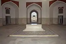 The symmetrical and simple designed on the exterior is in sharp contrast with the complex interior floor plan, of inner chambers, which is a square 'ninefold plan', where eight two-storied vaulted chambers radiate from the central, double-height domed chamber. It can be entered through an imposing entrance iwan (high arc) on the south, which is slightly recessed, while others sides are covered with intricate jaalis, stone latticework. Underneath this white dome in a domed chamber (hujra), lies the central octagonal sepulcher, the burial chamber containing a single cenotaph, that of the second Mughal Emperor, Humayun aligned on the north–south axis, as per Islamic tradition, wherein the head is placed to the north, while the face is turned sideways towards Mecca. The real burial chamber of the Emperor, however, lies further away in an underground chamber, exactly beneath the upper cenotaph, accessible through a separate passage outside the main structure, which remains mostly closed to visiting public. This burial technique along with pietra dura, a marble and even stone inlay ornamentation in numerous geometrical and arabesque patterns, seen all around the facade is an important legacy of the Indo-Islamic architecture, and flourished in many later mausolea of the Mughal Empire, like the Taj Mahal, where again we find twin cenotaphs and exquisite 'pietra dura' craftsmanship.[31]