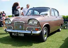 The Humber Sceptre MK I, introduced in 1963,[2] was a luxury car based on the Hillman Super Minx. It featured a unique roof, glass and upper/rear bodywork not shared with the Super Minx or the related Singer Vogue. The Sceptre was originally intended as a four-door replacement for the Sunbeam Rapier, but was launched as a Humber, while the Rapier continued in production with little modification until 1967. This resulted in the Sceptre being more sporty in character than traditional Humbers. The Sceptre was positioned at the top of the mid-range Rootes Group cars, above the Hillman Super Minx and Singer Vogue. It featured similar twin headlight styling to the Vogue and a more powerful 80 bhp (60 kW; 81 PS) version of the 1,592 cc (97.1 cu in) Minx engine. The high level of equipment included disc front brakes, overdrive, screen washers, reversing lamp, rev counter and a full range of instruments. Automatic transmission was made available later. A MK IA was introduced in 1964.[2] Whilst the Super Minx and Vogue received revised six light styling in 1964, the Sceptre body continued unchanged until 1965 when it was replaced by the MK II. Production of the MK I and IA models totaled 17,011 units.[3]