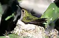 As far as is known, male hummingbirds do not take part in nesting.[78] Most species build a cup-shaped nest on the branch of a tree or shrub,[79] although a few tropical species normally attach their nests to leaves. The nest varies in size relative to the particular species – from smaller than half a walnut shell to several centimeters in diameter.[78][80]