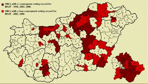 The image shows Single Member Constituencies (or SMCs) voting for MSZP in 1998, 2002, 2006 in dark red, while showing SMCs voting for MSZP in 2002 and 2006 in red. The dark red districts are considered the strongest positions of the party. Most if not all districts shown in dark red and red also voted for MSZP in 1994, a landslide victory for the party. So actually, dark red districts have an even longer uninterrupted voting history of supporting MSZP.