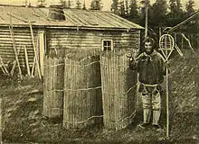 Most Neolithic settlements were situated on the banks of rivers and lakes in the proposed original homeland of the Uralic peoples, but no houses have been excavated there.[220] The local inhabitants primarily used tools made of stone – especially jasper from the southern Urals – , bone and wood, but baked clay vessels decorated with broken or wavy lines were also found.[221] Their economy was based on fishing, hunting, and gathering.[222] The basic Hungarian words connected to these activities – háló (net), íj (bow), nyíl (arrow), ideg (bowstring), and mony (egg) – are inherited from the Proto-Uralic period.[223][224] The Hungarian words for house (ház), dwelling (lak), door (ajtó), and bed (ágy) are of Proto-Finno-Ugric origin.[225] Houses built in the presumed Finno-Ugric homeland in the wider region of the Urals in the 3rd millennium BC show regional differences; in the valley of the Sosva River, square pit-houses were dug deep into the ground; along the Kama River, rectangular semi-pit houses were built.[226] The local people were hunter-gatherers.[88] They used egg-shaped, baked clay vessels that were decorated with rhombuses, triangles, and other geometrical forms.[227] They buried their dead in shallow graves and showered the bodies with red ochre.[228] They also placed objects including tools, jewels made of pierced boar tusks, and small pendants in the form of animal heads into the graves.[229] Copper objects found in the graves, which were manufactured in the Caucasus Mountains, indicate that the inhabitants of the lands on both sides of the Ural Mountains had trading contacts with faraway territories around 2000 BC.[230] Words from the Proto-Ugric period – ló ("horse"), nyereg ("saddle"), fék ("bridle"), and szekér ("wagon") – show that those who spoke this language rode horses.[231] Animal husbandry spread on both sides of the Urals from around 1500 BC.[232] The bones of domestic animals – cattle, goats, sheep, pigs, and horses – comprised 90% of all animal bones excavated in many settlements.[233] Loan words from Proto-Iranian suggest the Ugric-speaking populations adopted animal husbandry from neighboring peoples.[88][234] For instance, the Hungarian words for cow (tehén) and milk (tej) are of Proto-Iranian origin.[88] Archaeological finds – including seeds of millet, wheat, and barley, and tools including sickles, hoes, and spade handles – prove the local population also cultivated arable lands.[235]