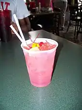 The Hurricane cocktail is a sweet alcoholic drink made with rum, lemon juice, and passion fruit syrup.[1] It is one of many popular drinks served in New Orleans. It is traditionally served in the tall, curvy eponymous "hurricane glass". Disposable plastic cups are also used because New Orleans laws permit drinking in public and leaving a bar with a drink but prohibit public drinking from glass containers.[2]