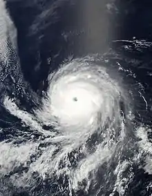 Although there were no factors inhibiting the development of Celia, the storm unexpectedly weakened again later on June 23. The storm's eye rapidly dissipated and the central dense overcast became asymmetric. Forecaster Todd Kimberlain at the NHC referred to the unexplained shifts in strength as "puzzling."[17] However, as suddenly as the weakening took place, strengthening ensued. Very strong convection formed over the center of the storm, with some cloud tops being as cold as −86 °C (−123 °F), but no eye had reformed by the morning of June 24.[18] Throughout the day, Celia became increasingly organized, with the eye fully reforming and the structure becoming more symmetrical.[19] Rapid intensification soon followed as the storm reached Category 4 status,[20] becoming one of only a handful of tropical cyclones to do so during the month of June in the eastern Pacific.[21] That evening, the storm further intensified into a Category 5 hurricane, the second storm to reach this strength during June in the Eastern Pacific basin on record.[22] Hurricane Celia attained its peak intensity around 00:00 UTC, with sustained winds of 160 mph (260 km/h) and a barometric pressure estimated at 921 mbar (hPa; 27.2 inHg).[1] The storm also displayed a well-defined eye estimated to be 17 to 23 mi (27 to 37 km) in diameter.[23]