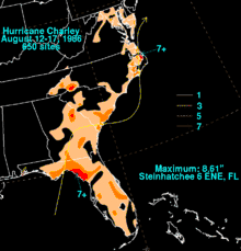 Hurricane Charley affected at least ten U.S. states,[8][10][14] resulting in five total deaths and $15 million in damage (1986 USD).[1] The precursor disturbance to Charley brought rainfall to much of Florida, including a total of 8.61 inches (219 millimetres) in Steinhatchee; that rainfall maxima was the greatest total associated with Charley within the United States.[14] The system also produced light to moderate rainfall across Georgia and South Carolina,[14] which proved beneficial as the region was in a major drought. However, its heaviest rainfall remained over open waters.[8]