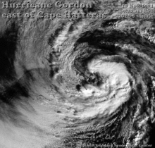 ![]() Hurricane Gordon near peak intensity off the coast of North Carolina on November 18 | |