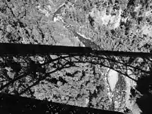 Construction of this bridge by the American Bridge Company began in early 1921. The first steel was erected in June, and the first passenger train operated on August 15 of the same year. It was the most difficult and expensive bridge project on the railroad, and cost $1.2 million. To build it, the company strung an aerial tram across the gulch, and construction proceeded from both sides simultaneously.[3] For eight years, this was the tallest bridge in the US.