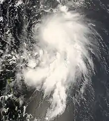 During late August 2008, a tropical wave emerged off the coast of Africa and tracked westward across the Atlantic Ocean. After several days, an associated area of low pressure gained deep convection and organization. On August 28, while to the east-northeast of the northern Leeward Islands, the low formed into Tropical Depression Eight. Later that day, it attained tropical storm status, and as such was named Hanna by the National Hurricane Center.[1] At the time, the low-level center of circulation was partially exposed on the western edge of the convection, indicating westerly wind shear.[2]
