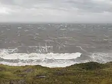 Once north of Bermuda, Igor began to undergo extratropical transition as it turned northeastward. Though deep convection was no longer consistently over its center, the storm maintained hurricane intensity as supported by data from Hurricane Hunters.[6] Accelerating along the leading edge of a trough over the Canadian Maritimes, the storm intensified within a baroclinic zone as it neared Newfoundland.[1] The interaction between these two systems allowed the hurricane to strengthen despite moving over decreasing sea surface temperatures.[7] Around 1500 UTC on September 21, Igor made landfall near Cape Race, with winds of 85 mph (140 km/h). Shortly thereafter, the storm completed its transition into an extratropical cyclone as it became fully embedded within the baroclinic zone. After turning northwestward between Labrador and Greenland, the remnants of Igor were absorbed by another extratropical cyclone on September 23, within the Labrador Sea.[1]