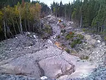 Roughly 150 communities were temporarily isolated as all roads leading to them were severely damaged or washed out.[23] Overall damage to roadways was regarded as "colossal" by Tom Hedderson, the minister for emergency preparedness.[29] A 100 ft (30 m) section of the Trans-Canada Highway in Terra Nova National Park was severely eroded, leaving a large ravine behind and disconnecting the main population of Newfoundland from the rest of the island. A bridge washout on the Burin Peninsula left 20,000 people cut off from the rest of the island.[23][24] Public infrastructure losses were estimated in excess of $100 million, mainly attributed to roadways.[30] On Random Island, a man was killed when his driveway collapsed from flooding and he was swept out to sea.[24]
