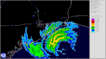 Despite tracking back over water, Ike's prolonged interaction with Cuba had greatly disrupted the system's core, and instead of quickly strengthening and coalescing, the storm's wind field instead grew and only gradual intensification ensued.[18] Due to the storm's comparatively small inner core and intensity of the outer rainbands,[22] an eyewall replacement cycle took place, preventing Ike from rapidly intensifying. At around the same time, a high-pressure area strengthened to the hurricane's north, steering the cyclone further west than initially anticipated. Moving over the warm waters of the Loop Current,[18] Ike reached a secondary minimum in barometric pressure on 00:00 UTC with an estimate of 944 mbar (27.9 inHg); though winds would continue to strengthen afterward, the storm's pressure would rise.[23] By late on September 12, Ike had reached the western edge of the nearby high-pressure area and began to curve northward. The formation of an eye just prior to landfall resulted in a slight increase in winds,[18] and at 0700 UTC on September 13, Ike made landfall on the northeast end of Galveston Island in Texas, with a minimum barometric pressure of 950 mbar (28 inHg) and sustained winds of 110 mph (180 km/h), making Ike a Category 2 hurricane.[23] After tracking inland, Ike weakened as it sped northward and later northeastward, weakening to tropical storm status east of Palestine, Texas late on September 13 and later becoming a powerful extratropical cyclone on September 14 over the Ozarks.[18] A more steady weakening phase ensued, and after tracking across southern Ontario and Quebec, the remnants of Ike were absorbed by another extratropical low near the St. Lawrence River, on September 15.[24]