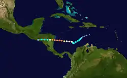 At 18:00 UTC on November 8, the National Hurricane Center (NHC) began to monitor the Central Caribbean for a tropical wave forecasted to enter the area and potentially become a low-pressure area within a few days.[8] The wave subsequently entered the Eastern Caribbean by 06:00 UTC on November 10 and moved westward into a more conducive environment for development.[9][10] Late on November 11, the wave started to become better organized, and by 15:00 UTC on November 13, it had developed into Tropical Depression Thirty-One in the southern Caribbean, tying 2005 for the most tropical depressions recorded in one season.[10][11][12] Six hours later, the system strengthened into Tropical Storm Iota.[13] After struggling somewhat due to wind shear and dry air, Iota began to rapidly intensify over warm waters late on November 14, as convection started to wrap around the storm's center.[14] At 06:00 UTC on November 15, Iota reached hurricane status, before strengthening to Category 2 status at 00:00 UTC on November 16.[15][16]