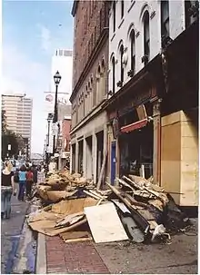 Damage was also reported in Prince Edward Island as a result of the storm, particularly around Charlottetown, where its waterfront sustained heavy wave damage to pleasure craft and sea walls, as well as significant damage to the older urban forest in that city's downtown core. Extensive tree damage was also reported across the island, as well as structural damage to weaker buildings, such as barns and silos.[3] The hurricane left portions of the island without power.[25] The narrow path meant that damage was quite localized; little damage was reported in New Brunswick or western Prince Edward Island.[26] Voting in the PEI general election on September 29 was also disrupted, though more than 80% of voters made it to polling stations.[27]