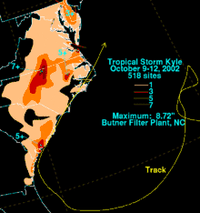 Moisture from Kyle extended into the Mid-Atlantic states and southern New York. The precipitation alleviated rainfall deficits throughout the region.[42] Overall damage amounted to about $5 million (2002 USD, $7.11 million 2021 USD).[1] While no deaths were reported directly from Kyle, its remnants contributed to one death in stormy seas off the British Isles.[31]