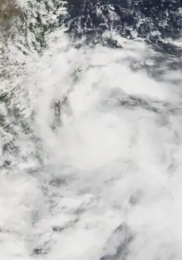 A strong area of high pressure over the western Gulf of Mexico forced the storm to turn southwestward, back to the Mexican coastline.[1] Increasingly deep cloud cover formed over the storm in response to a favorable environment over the Bay of Campeche. Late on October 3, forecasters at National Hurricane Center noted a statistical rapid intensity index indicating a 49% chance of Stan undergoing rapid intensification before its final landfall.[5] This intensification did take place within 12 hours before the hurricane moved onshore. Overnight, the structure of Stan rapidly improved, with a banding eye-feature developing within unusually deep convection with cloud-top temperatures measured at −90 °C (−130 °F) by infrared satellites.[6] Following this development, National Hurricane Center upgraded the storm to a Category 1 hurricane on the Saffir–Simpson Hurricane Scale. Around 1200 UTC on October 4, Stan made landfall near Punta Roca Partida, with winds of 80 mph (130 km/h). The storm also attained its lowest barometric pressure of 977 mbar (hPa; 28.85 inHg) at this time. Not long after moving over the mountainous terrain of central Mexico, Stan rapidly weakened to a tropical depression and fully dissipated early on October 5 over the state of Oaxaca.[1]
