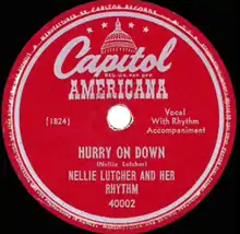 "Hurry on Down" is a song written and sung by Nellie Lutcher with backing on the record by a group called "Her Rhythm". Lutcher also played the piano on the record which was released in 1947 on the Capitol Americana label (catalog no. 40002). It debuted on the Billboard magazine's race records chart on August 16, 1947, peaked at No. 2, and remained on the chart for 18 weeks.[1] It was ranked No. 10 on the magazine's year-end list of the most played race records of 1947.[2]