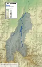 The Táchira River originates near Tamá, in the mountains of Las Banderas, at an altitude of 3,368 metres (11,050 ft) above sea level. The river flows towards the north, as a natural boundary between Colombia and Venezuela. It crosses the municipalities of Herrán, Ragonvalia, Villa del Rosario and Cúcuta. Tachira River flows into the Pamplonita River near the village El Escobal.