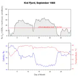 In a very short time the oxygen saturation can drop to zero when offshore blowing winds drive surface water out and anoxic depth water rises up. At the same time a decline in temperature and a rise in salinity is observed (from the longterm ecological observatory in the seas at Kiel Fjord, Germany). New approaches of long-term monitoring of oxygen regime in the ocean observe online the behavior of fish and zooplankton, which changes drastically under reduced oxygen saturations (ecoSCOPE) and already at very low levels of water pollution.