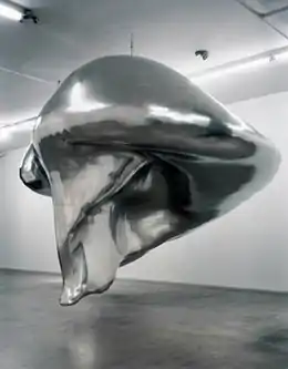 Three large-scale works employing technical processes of data gathering, modeling and fabrication connect science and political power. Cloud Prototype No. 1 (2003) used atmospheric data to create a gargantuan, amorphous titanium-alloy and fiberglass sculpture capturing the fleeting form of a thundercloud;[49][50][25] its frozen quality and resemblance to a nuclear blast cloud evoke liminal, transformative moments between benign and perilous, progress and destruction.[27][4][41] Phantom Truck (Documenta 12, 2007) was a physical realization of the biological weapons lab described (but never validated) in Colin Powell's 2003 United Nations speech leading up to the U.S. invasion of Iraq.[13][51] Manglano-Ovalle built the vaguely industrial, container-like structure using computer renderings based on satellite images, State Department renderings and descriptions in Powell's speech.[2][50][13] Displayed in a darkened gallery, the barely visible form was described by curator Elizabeth Armstrong as evoking the shadowy political camouflage that inspired it—"a chilling encounter with a fabrication of a falsehood."[2] Prototype for Re-Entry (2015) is an enlarged (36-foot) version of Brancusi's iconic Bird in Space sculpture suspended in flight that was commissioned for a U.S. Food and Drug Administration building that was once the site of a post-World War II weapons laboratory.[52][40] It uses the site's historical role and the aesthetics of Brancusi's work as points of departure to investigate the parallel searches of modern art and science/weapons development for perfection;[52][40] the project included a (successful) aerodynamics test of a reproduction of the sculpture in the site's still-active hypervelocity wind tunnel.[40][52]