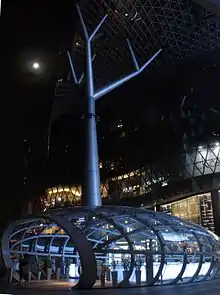 The mall has two subway entrances on Level 1 connecting to ION Orchard via Orchard. The first entrance, Exit E (facing Wheelock Place), was opened on the morning of 15 January 2008, the same day when the station's Exit C (facing Wisma Atria) was closed and slated to be demolished and subsequently completed later that year.[8] Mounted on Exit E's wall were more than 90 metres of LED walls, that can be programmed with different colours and patterns on its light displays to create a certain mood, even for festive occasions. It can also be used for advertising or as an art gallery from time to time.[8][9]