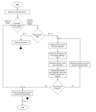 Under IPv4, a router that receives a network packet larger than the next hop's MTU has two options: drop the packet if the Don't Fragment (DF) flag bit is set in the packet's header and send an Internet Control Message Protocol (ICMP) message which indicates the condition Fragmentation Needed (Type 3, Code 4), or fragment the packet and send it over the link with a smaller MTU. Although originators may produce fragmented packets, IPv6 routers do not have the option to fragment further. Instead, network equipment is required to deliver any IPv6 packets or packet fragments smaller than or equal to 1280 bytes and IPv6 hosts are required to determine the optimal MTU through Path MTU Discovery before sending packets.