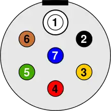 The physical design is also used by SAE J560 with basically the same configuration. The difference is that SAE J560 uses 12V (larger wire cross-section and higher amp rating on fuses). Pin 7 may also have a different behavior on SAE J560.[23][24][25]