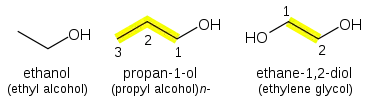 Alcohols (R-OH) take the suffix "-ol" with an infix numerical bonding position: CH3CH2CH2OH is propan-1-ol. The suffixes -diol, -triol, -tetraol, etc., are used for multiple -OH groups: Ethylene glycol CH2OHCH2OH is ethane-1,2-diol.