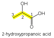 In general, carboxylic acids are named with the suffix -oic acid (etymologically a back-formation from benzoic acid). As with aldehydes, the carboxyl functional group must take the "1" position on the main chain and so the locant need not be stated. For example, CH3-CH(OH)-COOH (lactic acid) is named 2-hydroxypropanoic acid with no "1" stated. Some traditional names for common carboxylic acids (such as acetic acid) are in such widespread use that they are retained in IUPAC nomenclature,[3] though systematic names like ethanoic acid are also used. Carboxylic acids attached to a benzene ring are structural analogs of benzoic acid (Ph-COOH) and are named as one of its derivatives.