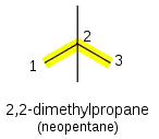 If there are multiple side-branches of the same size alkyl group, their positions are separated by commas and the group prefixed with di-, tri-, tetra-, etc., depending on the number of branches. For example, C(CH3)4 (neopentane) is named 2,2-dimethylpropane. If there are different groups, they are added in alphabetical order, separated by commas or hyphens: . The longest possible main alkane chain is used; therefore 3-ethyl-4-methylhexane instead of 2,3-diethylpentane, even though these describe equivalent structures. The di-, tri- etc. prefixes are ignored for the purpose of alphabetical ordering of side chains (e.g. 3-ethyl-2,4-dimethylpentane, not 2,4-dimethyl-3-ethylpentane).
