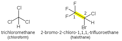 In Haloalkanes and Haloarenes (R-X), Halogen functional groups are prefixed with the bonding position and take the form of fluoro-, chloro-, bromo-, iodo-, etc., depending on the halogen. Multiple groups are dichloro-, trichloro-, etc., and dissimilar groups are ordered alphabetically as before. For example, CHCl3 (chloroform) is trichloromethane. The anesthetic Halothane (CF3CHBrCl) is 2-bromo-2-chloro-1,1,1-trifluoroethane.
