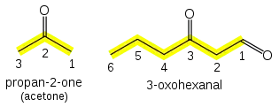 - The numbering of the molecule is based on the ketone groups. When numbering from left to right, the ketone groups are numbered 3 and 9. When numbering from right to left, the ketone groups are numbered 15 and 21. 3 is less than 15, therefore the ketones are numbered 3 and 9. The smaller number is always used, not the sum of the constituents numbers.
