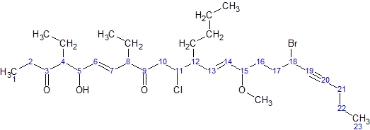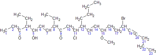 - The arrangement (with punctuation) is: 18-bromo-12-butyl-11-chloro-4,8-diethyl-5-hydroxy-15-methoxytricosa-6,13-dien-19-yne-3,9-dione