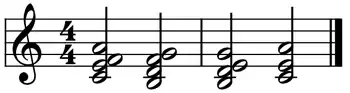 The IV△7–V7–iii7–vi progression, also known as the Ōdō shinkō (王道進行) or Koakuma chord progression (小悪魔コード進行, koakuma kōdo shinkō),[1] is a common chord progression within contemporary Japanese pop music. It involves the seventh chords of IV, V, and iii, along with a vi chord; for example, in the key of C major, this would be: F major 7–G7–E minor 7–A minor.[2][3]