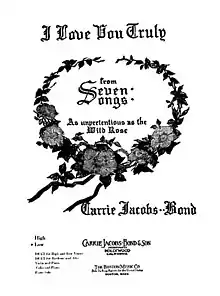 Carrie Jacobs-Bond began to write songs in 1894 to supplement the income of her husband, Frank Bond.[1] When he died in 1895, she returned briefly to her hometown of Janesville, Wisconsin, where "I Love You Truly" was written.[2] She then moved to Chicago where she painted china and rented out rooms to make ends meet.[1] There she continued to write songs and eventually sought to publish them herself. With the encouragement and assistance of friends, including a loan from contralto Jessie Bartlett Davis, in 1901 she published a sheet music collection of her compositions called Seven Songs as Unpretentious as the Wild Rose, one of which was "I Love You Truly".[1] She published it again as a separate song in 1906, at the same time correcting an oversight and filing for copyright. It sold over a million copies,[3] one of the earliest songs composed by a woman to achieve that distinction.[lower-alpha 1] Jacobs-Bond was invited to sing at the White House by three presidents, and each time sang "I Love You Truly".[3]