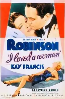 I Loved a Woman is a 1933 American pre-Code drama directed by Alfred E. Green, starring Kay Francis, Edward G. Robinson, and Genevieve Tobin. According to producer Hal Wallis' autobiography (with Charles Higham), Robinson and Francis "were oddly matched. Kay was so tall that we had to put Eddie [Robinson] on a box in some scenes to bring him level with her and, understandably he was humiliated. Irritable and self-conscious, he argued with Kay frequently. But he [...] gave credit to her fine acting." However, it was Wallis and other executives who also made the choice to cut three of Kay's scenes, leaving her presence in the film really as a supporting actor.[1]