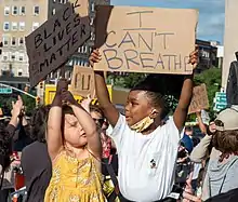 "I can't breathe" is a slogan associated with the Black Lives Matter movement in the United States. The phrase originates from the last words of Eric Garner, an unarmed black man who was killed in 2014 after being put in a chokehold by New York City Police. A number of other African-Americans, such as Javier Ambler, Manuel Ellis, Elijah McClain, and George Floyd, have said the same phrase prior to dying during similar law-enforcement encounters.[1][2][3] According to a 2020 report by the New York Times, the phrase has been used by over 70 people who died in police custody.[4]