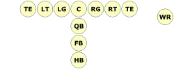 The formation begins with the usual 5 offensive linemen (2 offensive tackles, 2 guards, and a center), the quarterback under center, and two backs in-line behind the quarterback. The base variant adds a tight end to one side of the line and two wide receivers, one at each end of the line.
