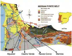 The Iberian Pyrite Belt is a vast geographical area with particular geological features that stretches along much of the south of the Iberian Peninsula, from Portugal to Spain. It is about 250 km long and 30–50 km wide, running northwest to southeast from Alcácer do Sal (Portugal) to Sevilla (Spain).[1] The mining activity in this region goes back thousands of years.