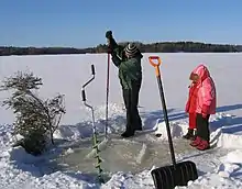Ice fishing is the practice of catching fish with lines and fish hooks or spears through an opening in the ice on a frozen body of water. Ice fishers may fish in the open or in heated enclosures, some with bunks and amenities.