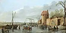 In 1825, John Franklin wrote "The game of hockey played on the ice was the morning sport" on Great Bear Lake during one of his Arctic expeditions. A mid-1830s watercolour portrays New Brunswick lieutenant-governor Archibald Campbell and his family with British soldiers on skates playing a stick-on-ice sport. Captain R.G.A. Levinge, a British Army officer in New Brunswick during Campbell's time, wrote about "hockey on ice" on Chippewa Creek (a tributary of the Niagara River) in 1839. In 1843 another British Army officer in Kingston, Ontario wrote, "Began to skate this year, improved quickly and had great fun at hockey on the ice."[20] An 1859 Boston Evening Gazette article referred to an early game of hockey on ice in Halifax that year.[21] An 1835 painting by John O'Toole depicts skaters with sticks and bung on a frozen stream in the American state of West Virginia, at that time still part of Virginia.[18]