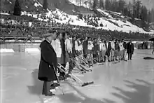 Eleven teams participated in the 1928 Winter Olympics in St. Moritz, Switzerland. The Canadian team was given a bye to the medal round and won all of its games by a combined score of 38–0.[22] The Swedish and Swiss teams won their first medals—silver and bronze respectively—and a German team participated for the first time, finishing ninth.[23] At the 1932 Winter Olympics, Canada won gold in a tournament that consisted of four teams that played each other twice.[24] Germany won bronze, the nation's first medal in the sport.[25]