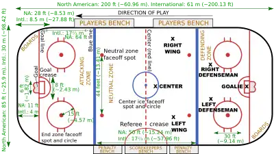 The current IIHF rules differ slightly from the rules used in the NHL.[174] One difference between NHL and IIHF rules is standard rink dimensions: the NHL rink is narrower, measuring 61 m × 26 m (200 ft × 85 ft), instead of the international size of 61 m × 30.5 m (200 ft × 100 ft)[175] The larger international size allows for a faster and less physical style of play.[176][177] Another rule difference between the NHL and the IIHF rules concerns how icing is called. In the NHL, a linesman stops play due to icing if a defending player (other than the goaltender) is not behind an attacking player in the race to the end-zone faceoff dots in his defensive zone,[178] in contrast to the IIHF rules in which play is stopped the moment the puck crosses the goal line.[178] The NHL and IIHF also differ in penalty rules. The NHL calls five-minute major penalties for more dangerous infractions of the rules, such as fighting, in addition to the minor and double minor penalties called in IIHF games.[179] This is in contrast to the IIHF rule, by which players who fight risk a game misconduct & major penalties.[180] Beginning with the 2005–06 season, the NHL instituted several new rules. Some were already used by the IIHF, such as the shootout and the two-line pass.[181] Others were not picked up by the IIHF, such as those requiring smaller goaltender equipment and the addition of the goaltender trapezoid to the rink.[182] However, the IIHF did agree to follow the NHL's zero-tolerance policy on obstruction and required referees to call more hooking, holding, and interference penalties.[183][184]